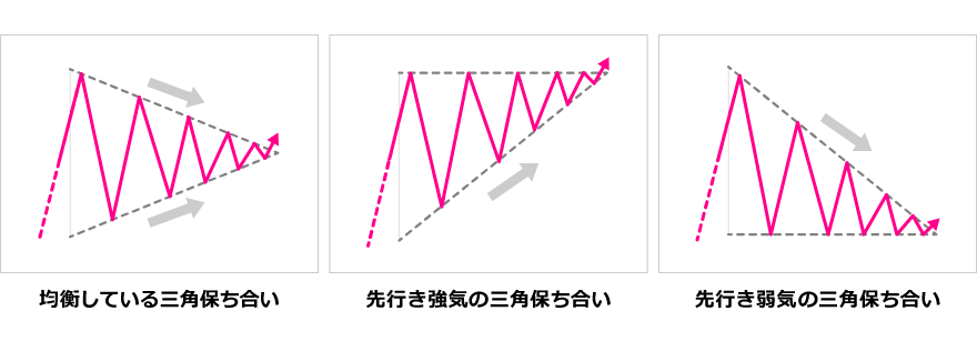 上昇トレンドの途中で 三角保ち合いが出現した場合は、上昇が継続すると予想されます。反対に下落トレンドの途中で出現した場合は、下落に向かう可能性が高い状態を示します。