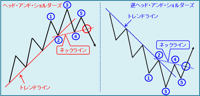 - ヘッドアンドショルダー:トレンド転換を示すパターンで、高確率で反転します。