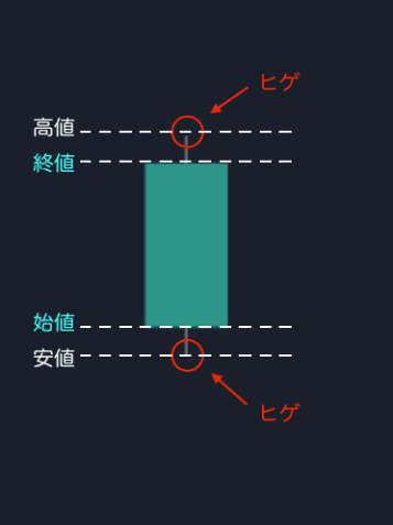 - ヒゲ:ローソク足の上下に伸びる線で、その期間内の最高値と最安値を示します。