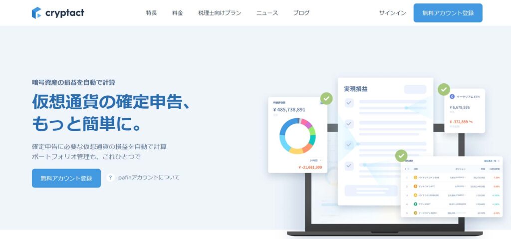 | クリプタクト | 国内取引所の自動対応が利用できる。1回のファイル容量50MB。年間取引件数50件まで。 | 有料プランは年額8,000円から。ランクに応じて機能が開放される。海外取引所の自動対応はライトプランから、すべての機能を利用できるのはアドバンスプランからになる。プランに応じてファイル容量/年間取引件数が増える。 |
