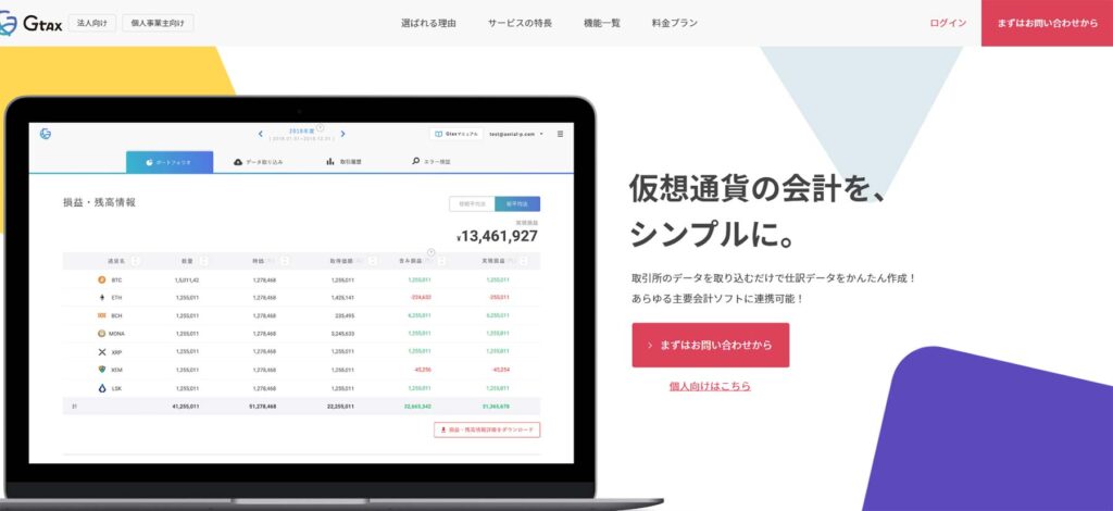 「Gtax」は、個人向けだけでなく法人や税理士向けにも対応した仮想通貨税金計算ツールです。