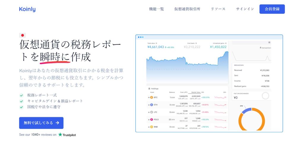「Koinly」は、取引所やウォレットからデータを自動同期し、損益計算やキャピタルゲイン・ロスを自動で算出するツールです。秘密鍵なしで取引所アカウントやウォレット情報を安全に管理できる点が特徴です。