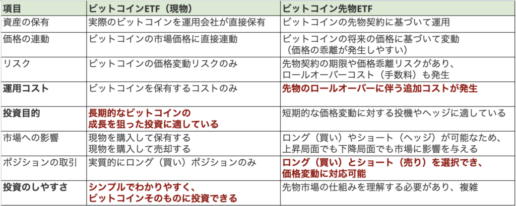 - 先物型ビットコインETF:ビットコインの先物契約に基づくETFで、将来のビットコイン価格を予測して運用します。2021年に米国で初めて承認されましたが、先物取引特有の価格乖離やロールオーバー時の追加コストなどが課題とされています[1][2]。